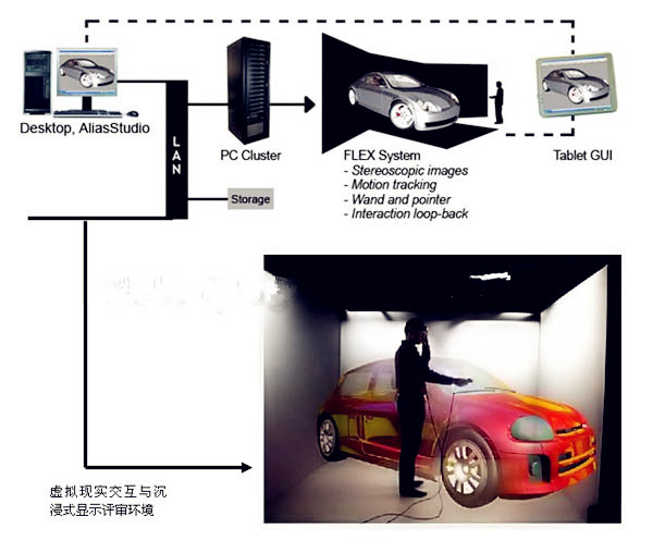 Immersion公司的虛擬現(xiàn)實(shí)系統(tǒng)與虛擬設(shè)計(jì)解決方案主要是基于AliasStudio3D工業(yè)設(shè)計(jì)系統(tǒng)的虛擬現(xiàn)實(shí)同步應(yīng)用方案,系統(tǒng)方案可以將AliasStudio 3D桌面工作流程同步輸出至一個(gè)虛擬現(xiàn)實(shí)環(huán)境,并提供實(shí)時(shí)的3D渲染和交互機(jī)制以及1:1的沉浸式視覺(jué)體驗(yàn),為三維